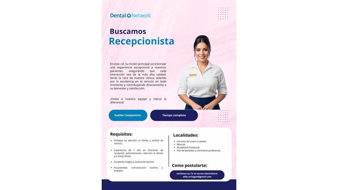 ¡Si eres una persona organizada, con excelente actitud de servicio y buscas unirte a un equipo líder en el cuidado de la salud dental, te invitamos a postularte!