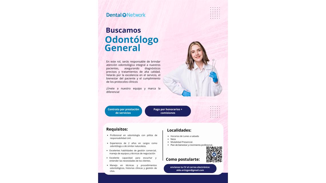 - Experiencia: Mínimo de 2 años como Odontólogo(a) General. La experiencia en redes de clínicas dentales es un plus.